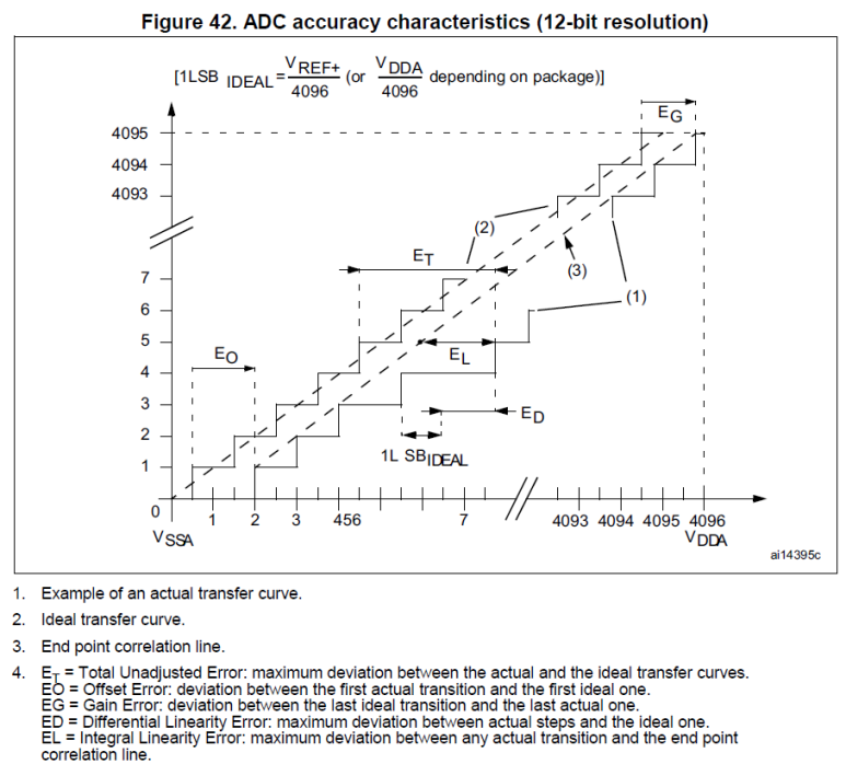 STM32 ADC에는 다양한 정확도 오류 유형이 있습니다. 참조하기 쉽도록 정확도 오류는 1 LSB의 배수로 표시됩니다. 전압 단위의 분해능(Resolution)은 기준 전압에 따라 달라집니다. 전압 측면에서 볼 때 오차는 LSB 수에 1 LSB에 해당하는 전압을 곱하여 계산됩니다.