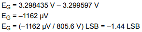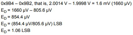 따라서 ED는 더 높은(2.0014V) 아날로그 전압과 더 낮은(1.9998V) 아날로그 전압 간의 전압 차이에서 1LSB에 해당하는 전압을 뺀 값입니다.
