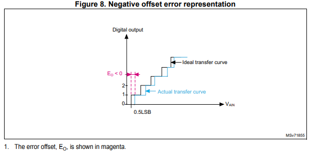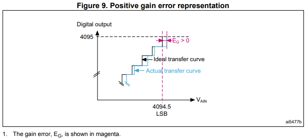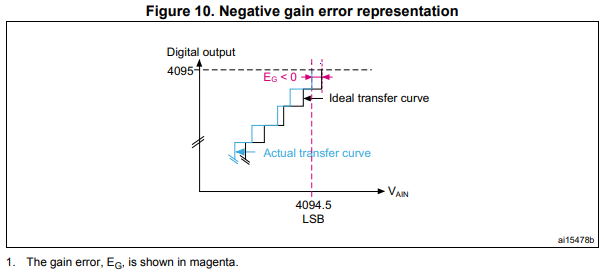 ADC가 VAIN < VREF+ – 0.5 LSB에 대해 0xFFF 판독값을 제공하면 음의 게인 오류가 발생합니다.