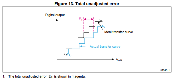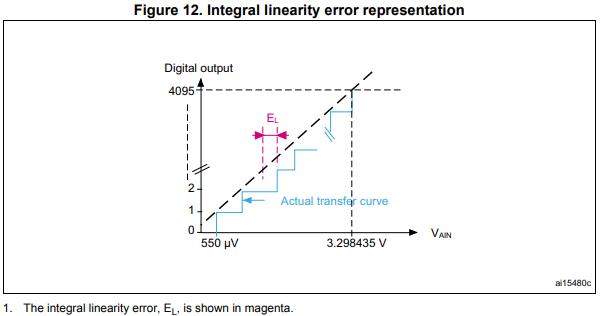 ILE는 DLE의 통합이므로 최대 오류의 표시기로 간주될 수 있습니다. 디지털 단계에서 발생할 수 있는 최대 오류를 계산하기 위해 DLE와 ILE를 함께 더하면 안됩니다. 각 MCU 데이터시트에 명시된 최대 오류 값은 지정된 전압 및 온도 범위에 걸쳐 실험실 테스트 환경에서 측정된 최악의 오류 값입니다(데이터시트 참조).