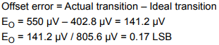 오프셋 오류는 첫 번째 실제(Actual) 전환과 첫 번째 이상적인(Ideal) 전환 간의 편차입니다. 첫 번째 전환은 디지털 ADC 출력이 0에서 1로 변경될 때 발생합니다. 원래 이상적으로는 아날로그 입력 범위가 0.5 LSB에서 1.5 LSB 사이인 경우 디지털 출력은 1이어야 합니다(이상적으로는 첫 번째 전환이 0.5 LSB에서 발생해야 함) 오프셋 오류는 EO로 표시되며 애플리케이션 펌웨어로 쉽게 보정할 수 있습니다.