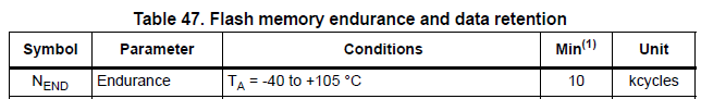 아래는 STM32G4의 수명입니다. 약 10K(만번)의 Erase 횟수 제한을 가지고 있습니다.