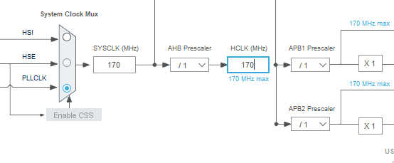 따라서 CubeMX의 RCC설정에서 Power Regulator Voltage Scale 1 boost로 설정하고 다시 170MHz로 설정하면 정상적으로 설정이 되는 것을 확인 할 수 있습니다.