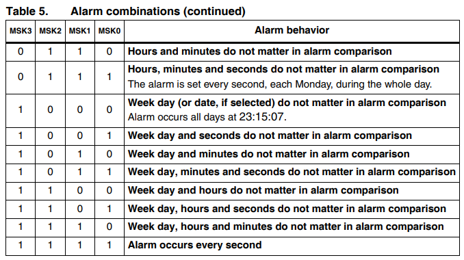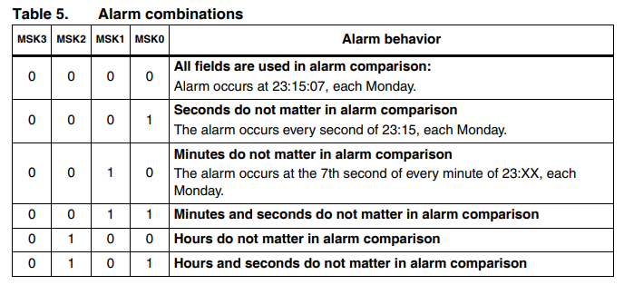 추가로 Mask 설정에 따라 알람의 방법을 달리 할 수 있습니다. 세팅되어 있는 MSKx에 따라 시간 혹은 날짜 알람을 무시하게 됩니다.