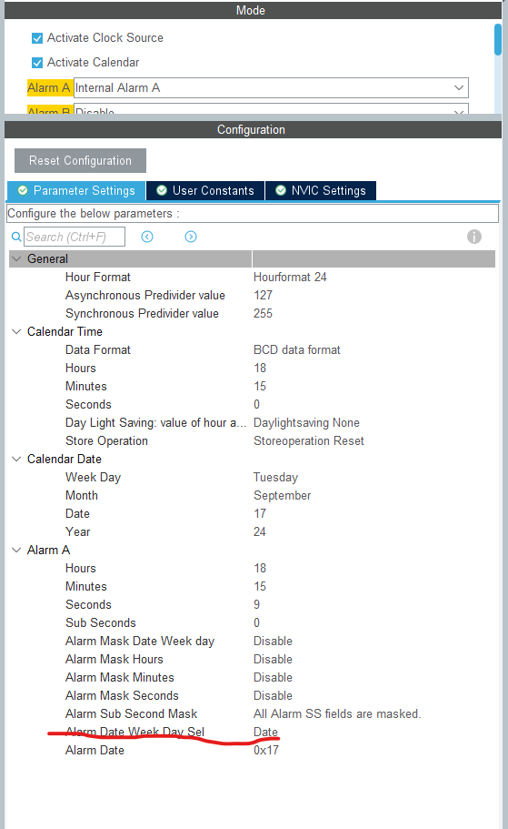 RTC Alarm 설정을 하기 위해선 아래와 같은 CubeMX에서 설정을 해주어야 합니다. 그런데 요기서 Alarm Date Week Day Sel이라는 파라메터가 있는데 뭔지 좀 헷갈립니다.