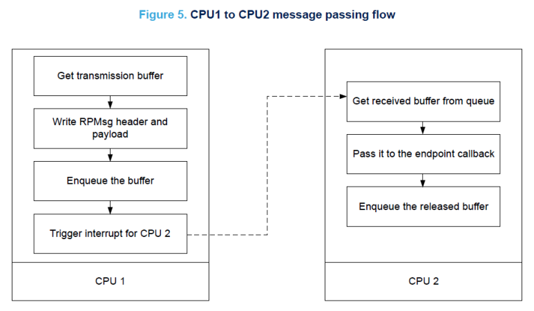 데이터를 전송하는 마스터 코어인 CPU1은 전송에 사용되는 공유 메모리에서 버퍼를 할당하고 여기에 RPMsg 헤더와 데이터 페이로드를 씁니다. 마지막으로 링 버퍼의 버퍼를 대기열에 넣어 CPU2에서 사용할 수 있도록 합니다. 이 순서는 다음과 같습니다.